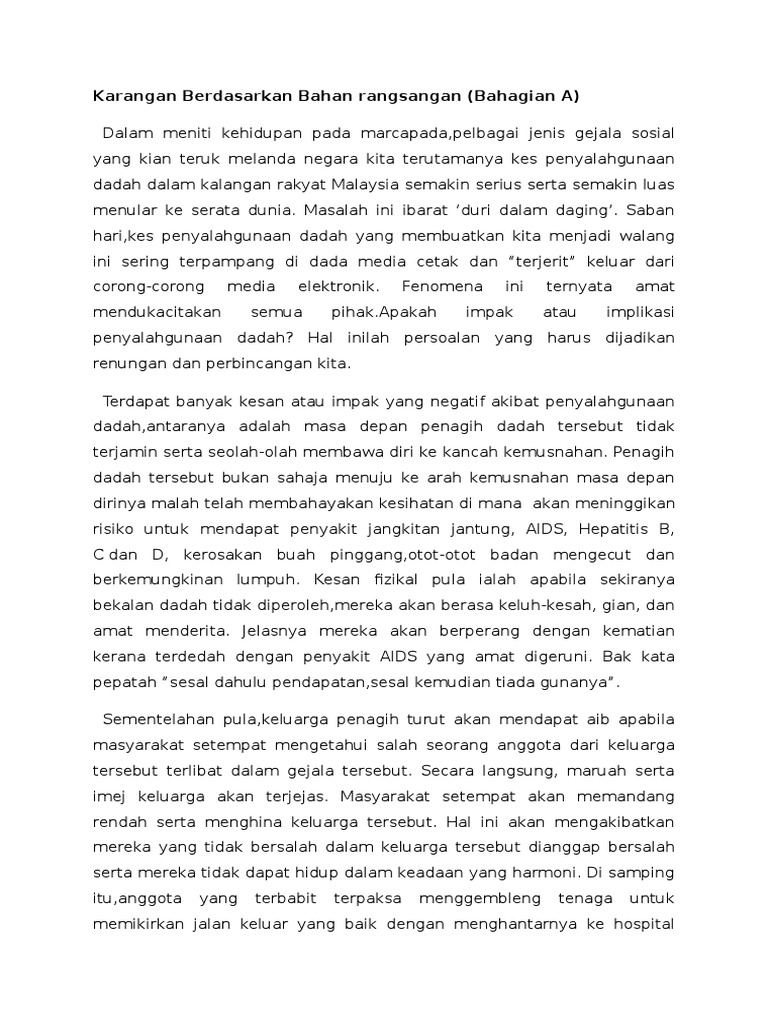 Perkongsian ilmu untuk diamalkan demi menjana iman. Sekolah boleh mengadakan aktiviti-aktiviti yang boleh mendatangkan. Karangan Berdasarkan Bahan rangsangan Bahagian A Dalam meniti kehidupan pada marcapadapelbagai jenis gejala sosial yang kian teruk melanda negara kita terutamanya kes penyalahgunaan dadah dalam kalangan rakyat Malaysia semakin serius serta semakin luas menular ke serata dunia.
